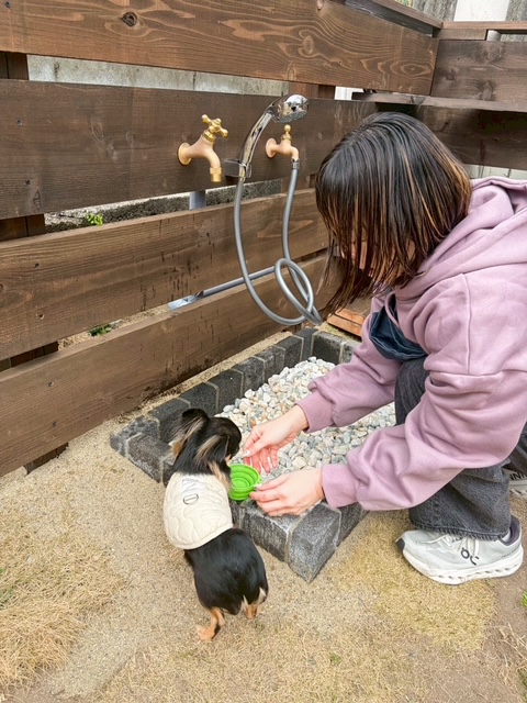 汚れても大丈夫!ワンちゃんも気持ちいい足洗いスペース。水分補給もわすれずにね!