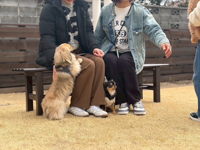 ベンチでひと休み。ワンちゃんたちもひと休みしてね(笑)